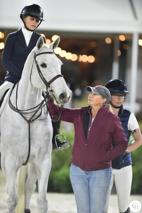 The R.W. Mutch Equitation Championship provides a special challenge for junior riders, who qualify by earning a primary-colored ribbon in a 3’6” or higher equitation class during Desert Circuit. Competitors surrender their cell phones and wave goodbye to their trainers and parents, as they are sequestered from them for the duration of the class. Riders must walk the course on their own and warm up on their own, and they are awarded between -2 and +2 points by a warm-up judge based on how they prepare their mounts for the class.