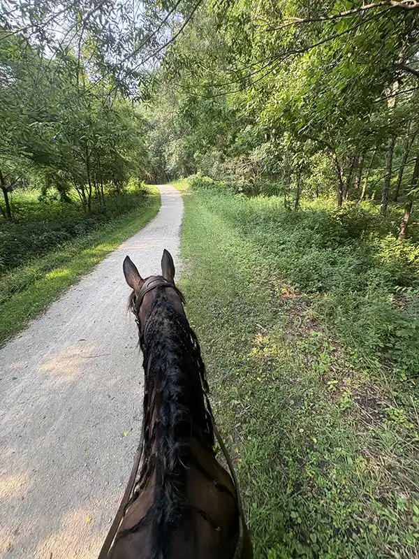 So here was an option that gave me that freedom—and turned a horse show weekend into a two-for-one camping trail ride. UDJC uses HorseSpot.net as its show software, and the start times for classes are updated throughout the day. So when my Sunday class wasn’t scheduled to start until noon, I slept in, made some coffee, moseyed around the campsite with my dog, and then, while still wearing my oversized T-shirt and pajama pants, tacked up Moji for a walk around the trails to stretch his legs. Sure beats sitting on a trunk in front of my stall waiting for my class to start! Around 11:20 a.m, I loaded him to make the 15-minute drive from the campground to the show.