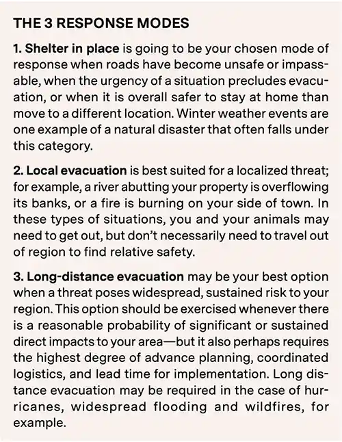 When it comes to navigating a natural disaster, experts share that your emergency preparedness plan needs to be flexible and able to address three different response modes: shelter in place, local evacuation, and long-distance evacuation (see sidebar). Each option comes with its own considerations and planning requirements.