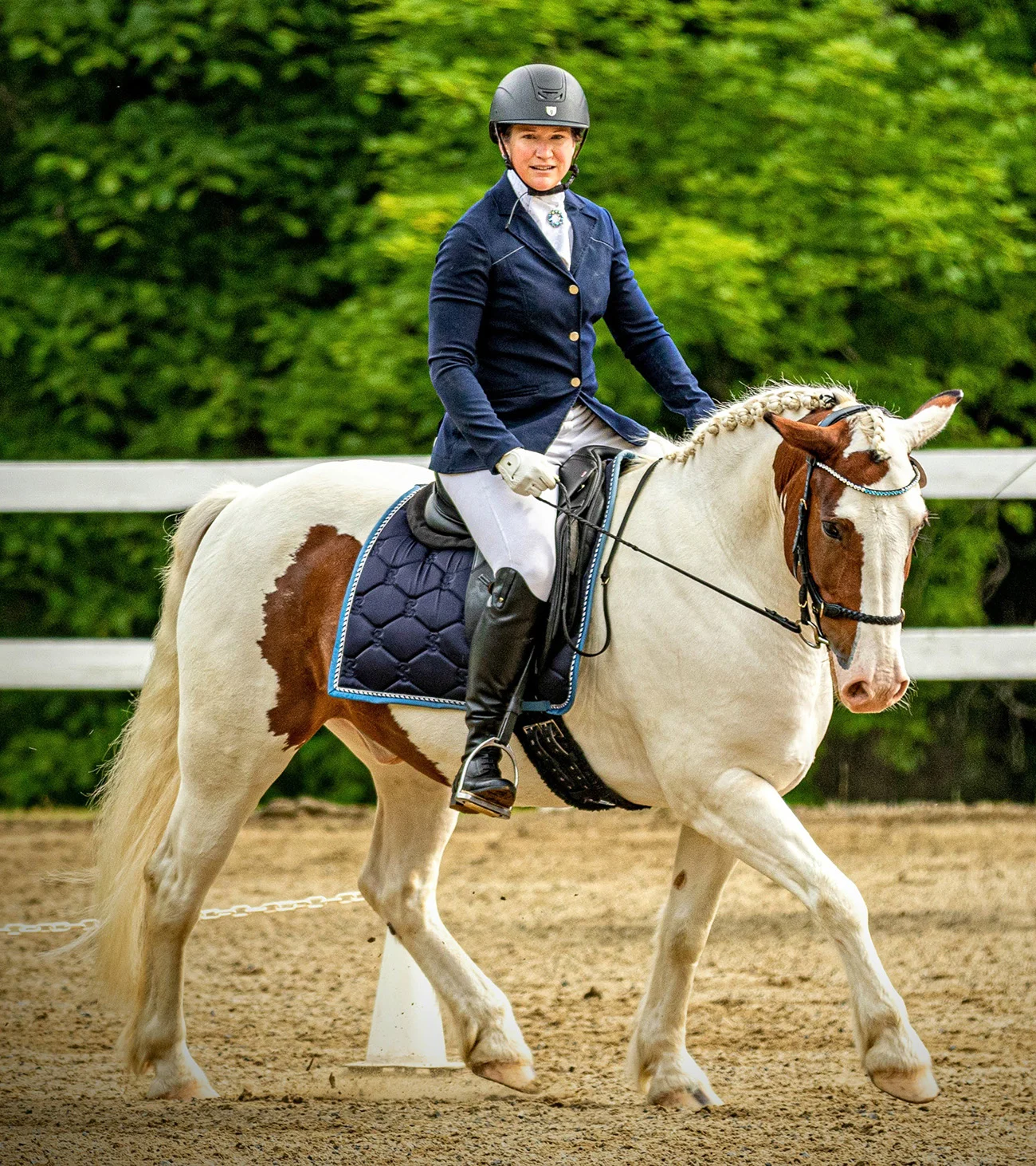 Given that 2023 was their first show season together—and that Laura hadn’t competed in over a decade—she decided to focus on introductory level. Over the course of the season, she learned to keep Tinker better organized and balanced, while he continued to build strength and confidence. As their partnership grew, Laura branched out to compete in the Tri-State Horseman’s Association dressage series as well as the shows held at CEC.