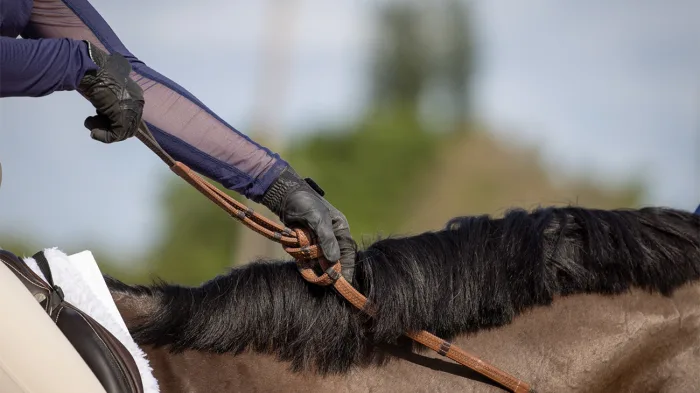 “When your reins are too long, you can’t react fast enough,” Kursinski said. “You should have a short rein with a long, elastic arm. There is a lot you can do with a short rein.”