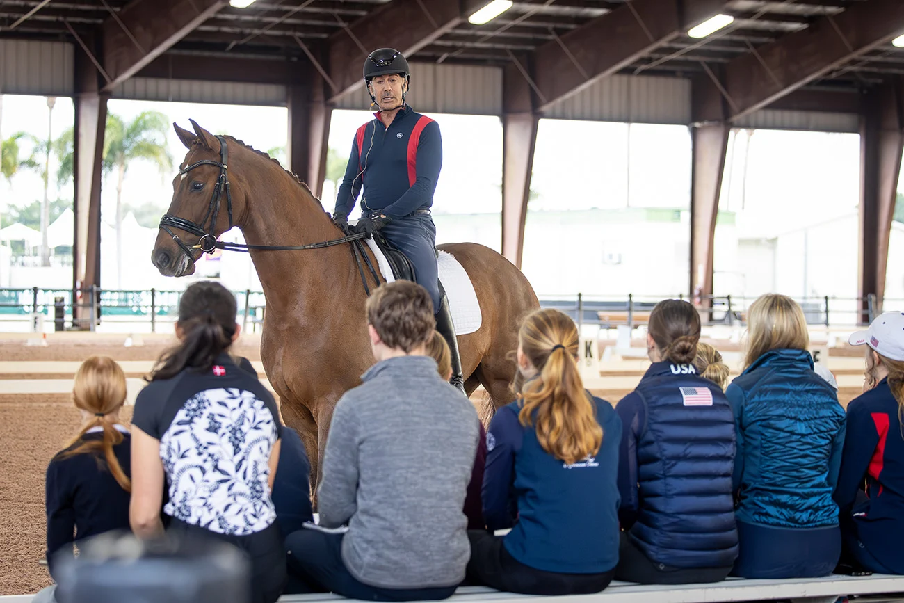 From young horse tests to Grand Prix movements, Thursday’s lessons addressed a wide variety of exercises. Influencing the horse with the quietest aids possible was a theme across many of those from the very beginning of the day, even before the first participants got into their saddles.