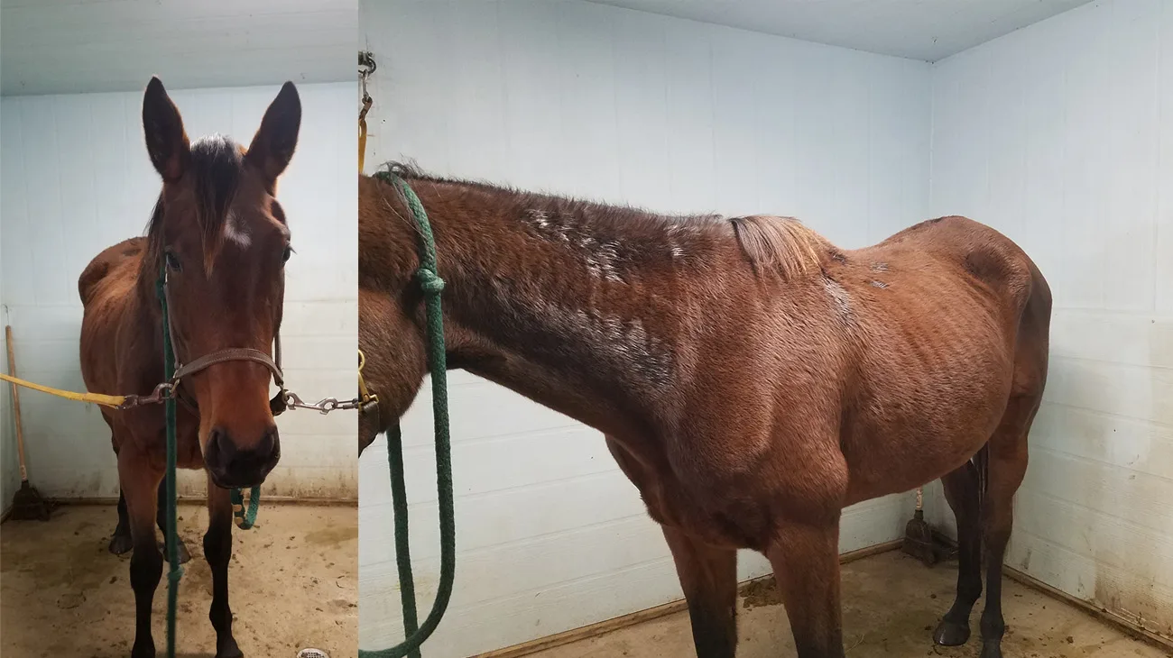 “Her owner would come and feed her and the other horse she had on the weekends,” Jessica continued. “Other than that, there was a round bale that was all molded, and probably was not even suitable for cows. Their only source of water was a drainage pond. I was like, ‘I can’t leave this horse here.’ ”