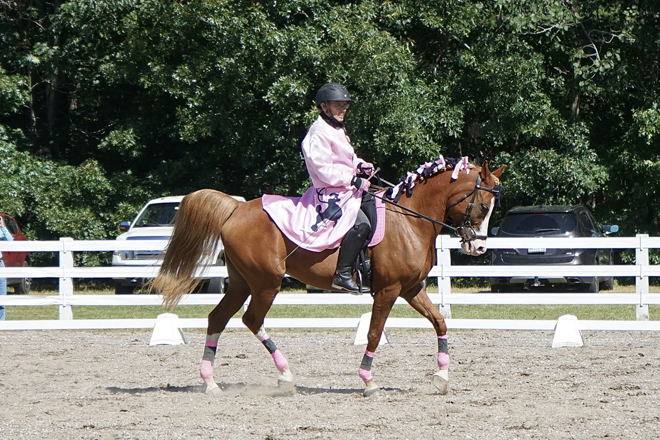 On a sunny September afternoon, several dozen eager spectators lined the rail at the State of Maine Dressage Association’s final show of the season. The first strains of Chubby Checker’s iconic hit “Pony Time” began to play, and Robyn Cuffey, bedecked in a homemade pink satin poodle skirt and matching jacket, rode into the arena on her diminutive 14.1-hand Arabian gelding, Dimitri. The pair showed off some of Dimitri’s best moves, including half-pass, leg yield, medium gaits and counter-canter, with a few flying changes sprinkled in just for fun. Their playful dance brought a smile to nearly everyone’s face, including Cuffey’s.