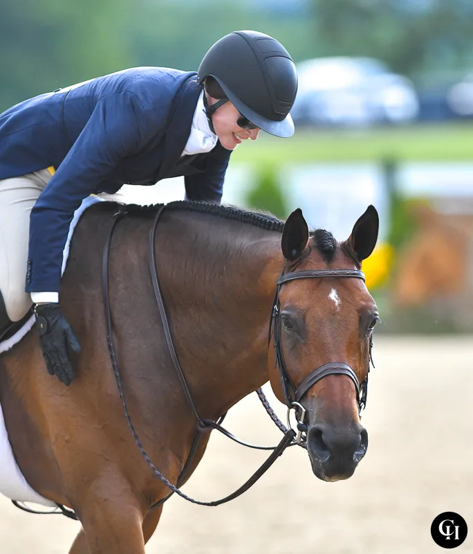 Colvin has been riding Blue for two years now, so she’s gotten to know him really well. But he was for sale earlier this year, so she wasn’t sure if she’d be able to keep the ride for derby finals. Then John and Stephanie Ingram (who owned her first derby champion Cuba) purchased Blue, and they had her keep the ride—however things are a bit different, as he’s now based with their trainer Tom Wright. Colvin and Blue reunited earlier this week for the Platinum Performance USHJA 3’6″/3’9″ Green Hunter Incentive Championship, where they were second.