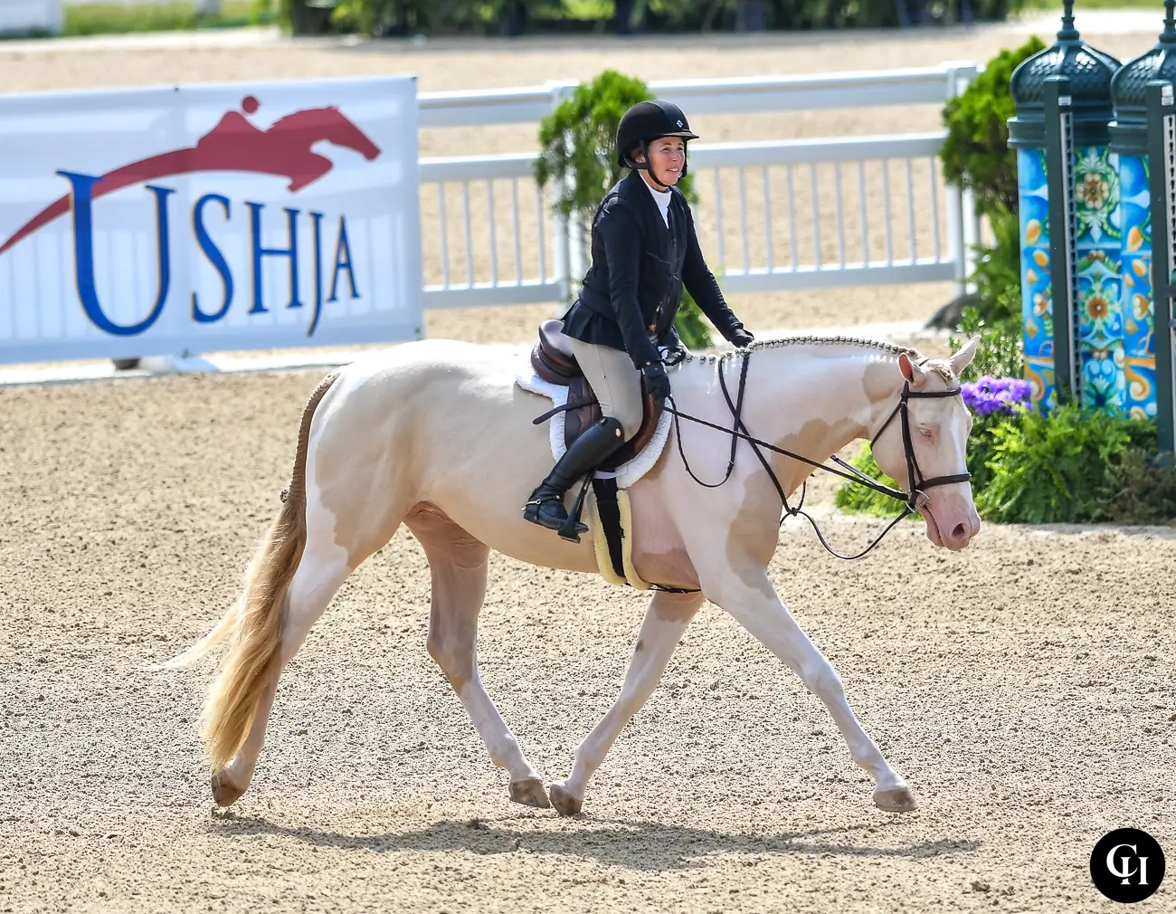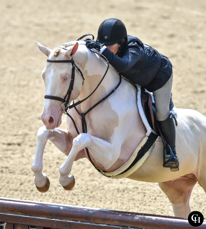 In a sea of bays, grays and chestnuts in the Platinum Performance USHJA 3’/3’3″ Green Hunter Incentive Championship, GFS Mikado stood out when he entered the Rolex Stadium at the Kentucky Horse Park. With his smokey cream tobiano coloring, the warmblood stallion has a look more often found in the pony ring than in the green hunters.