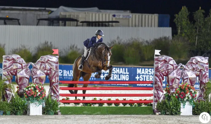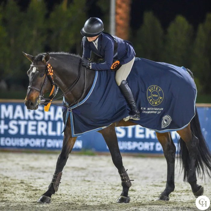 The R.W. Mutch Equitation Championship provides a special challenge for junior riders, who qualify by earning a primary-colored ribbon in a 3’6” or higher equitation class during Desert Circuit. Competitors surrender their cell phones and wave goodbye to their trainers and parents, as they are sequestered from them for the duration of the class. Riders must walk the course on their own and warm up on their own, and they are awarded between -2 and +2 points by a warm-up judge based on how they prepare their mounts for the class.