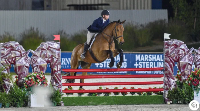 “I’ve never really practiced [counter-cantering] that much with him,” said Tatum, Pacific Palisades, California. “So the first time I didn’t plan that. He actually just landed [on the counter lead], and I could feel him paying attention to me. So I was like, ‘I think he’ll be OK. It’s a pretty wide corner.’ But then the other one, he landed on the counter lead, but I did a lead change on purpose. I asked him to do that because it was such a harsh angle, I didn’t want to risk falling off of it, so I just walked and picked up the right lead. And then once I got through that part, he is pretty good at trot fences and just allowing up the nine. I’ll get there right there. So I was pretty relieved once I got the counter-countering over.”