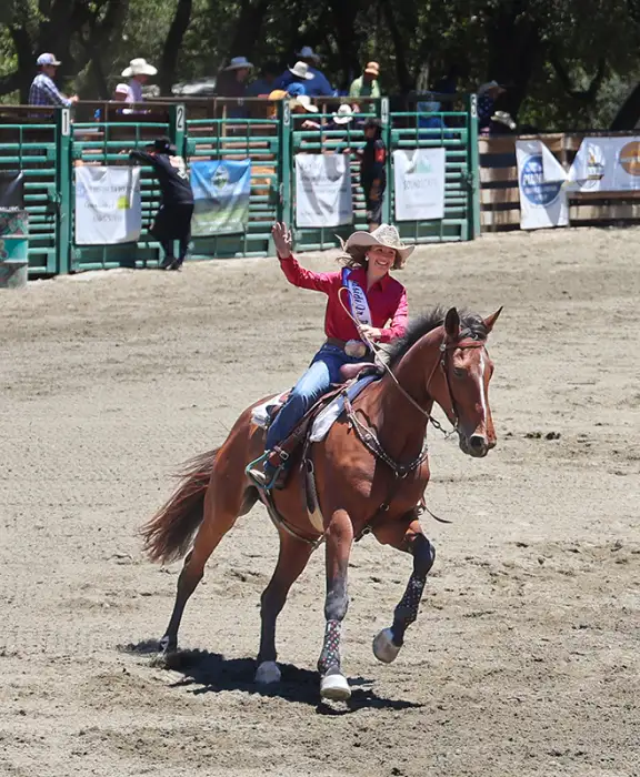 But as this year’s rodeo approached, Slocum realized that, at 18, she had this one last shot at adding “Woodside Junior Rodeo Queen” to her resume. She sent in an application and was invited to participate in the ridden session. Because she didn’t have a western horse at the ready, she brought Patito, her preliminary-level eventing mare she’d ridden in western tack just once the previous week.
