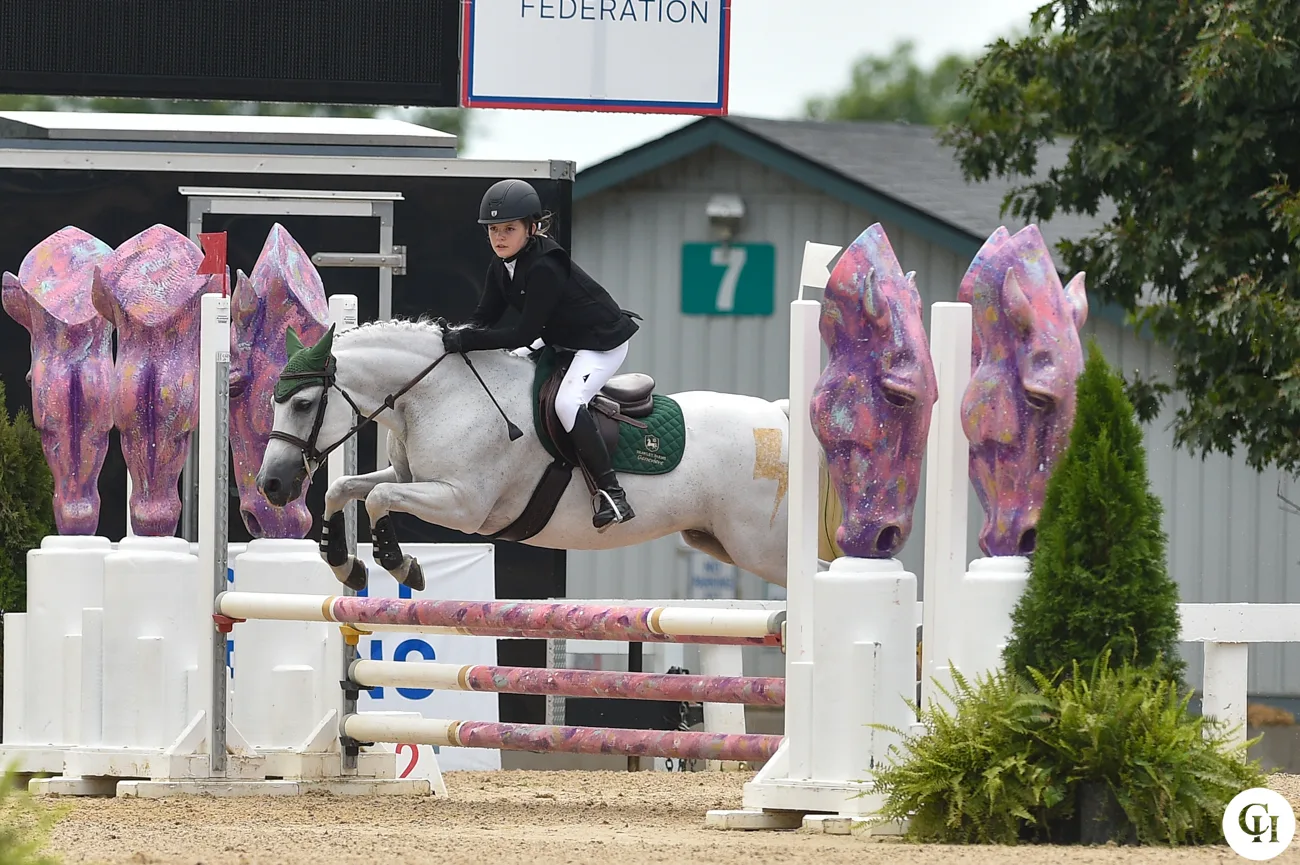 After a tough year of competition last year in which nine of the 26 rounds in the team competition ended in elimination, this year the Pony Jumper National Championships got a major revamp. Previously all ponies jumped 1.05 meters. Now there are four height sections: small ponies jump .65 meters, medium ponies jump .75 meters, larges jump .85 meters, and an open 1.05 meter section. At this year’s competition the small/medium ponies have been combined, with a little less than 50% of the competitors aboard small ponies. Larges and the 1.05 meter divisions have been combined as well, with 10% of the entries competing at the 1.05 meter height.
