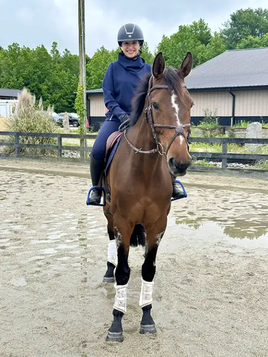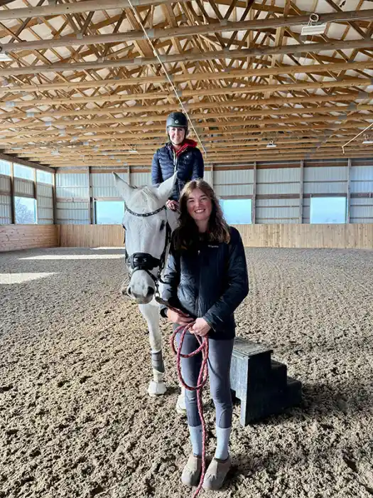 “Oink,” a 17-year-old Thoroughbred, (Perfect Soul—Crousille, Highest Honor) had a long racing career that led to an eventing career before ending up at the nonprofit Center for Racehorse Retraining in Cheyenne, Wyoming. Foust, a registered psychotherapist and former three-day eventer, took him on a care lease in 2022. He became a treasured lesson horse for her, taking adults and children from their first rides to their first shows, in addition to doing therapy work for her Body N Soul Integrative Equestrian Services.