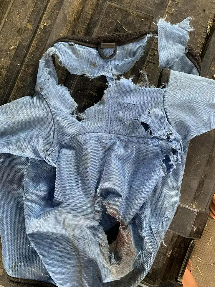 Foust followed the vet’s advice, and after describing the two incidents and submitting pictures of the injured horses, a CPW officer was assigned to visit their farm and search for evidence. The investigation didn’t yield anything definitive, though they located the missing fly mask, which appeared to have been clawed, so Sunny’s injuries were classified as a suspected mountain lion attack.