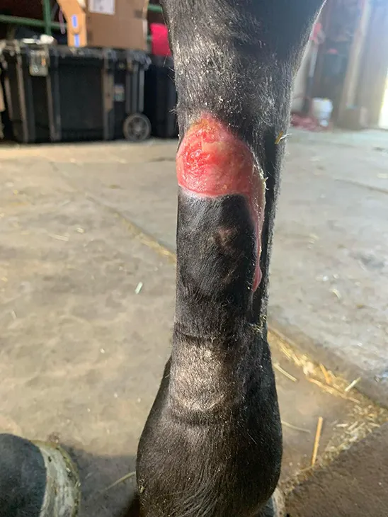 “He kind of looked like he had rolled in barbed wire, which our fencing isn’t barbed wire, but we get pretty high winds, so we didn’t know if some had blown in, and he had gotten tangled in it,” she said. He’d degloved his right front leg, injured his shoulder, and his neck, side and haunches were littered with scratches.