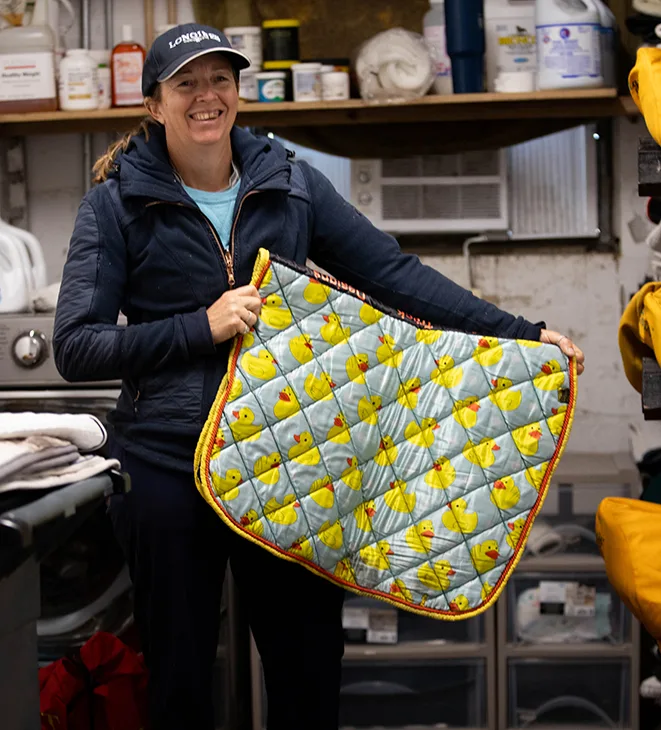 Ducky got his nickname from the collection of rubber ducks that live on the dashboard of owner Debbie Smith’s Jeep. (Trading rubber ducks is a tradition among Jeep owners.) Since Smith purchased him in 2023, the gelding has amassed an impressive collection of his own waterfowl-themed gear, including: