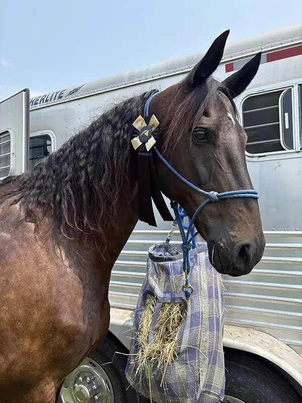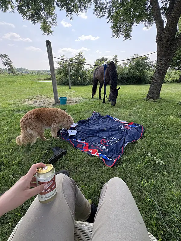 So, after working the full day the Friday before the show (all of the classes for the show were on Saturday and Sunday—bless up for the working amateur), I grabbed my dog and loaded the trailer at 6 p.m. to make the two-hour drive to the campground. I arrived a little after 8 p.m. and got my horse Moji set up in his spot; in an ideal world, I prefer to camp at sites with paddocks, but this one only had hitching posts where you could rig a tie line. Luckily Moji couldn’t care less, so I strung up the line, secured his rope halter to it with a safety knot, and he was good to go.