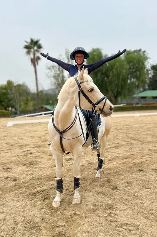 But back home in California, she continued to work with Blue and showed in open classes. In 2021, they competed at first level, and Andie Sue was named the Thoroughbred Incentive Program Young Rider of the Year by the Jockey Club. In 2022, they had their winningest season yet; concentrating on shows hosted by the California Dressage Society, Blue was named the TIP National Champion at training level and reserve National Champion at first level in the west coast division, and Andie Sue was named the TIP champion junior dressage rider.